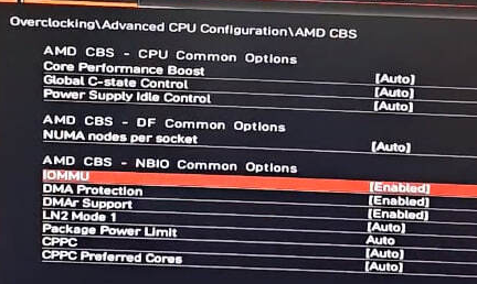 2. 进入Advanced->AMD_CBS,找到IOMMU,将之后Disabled/Auto更改为Disabled。