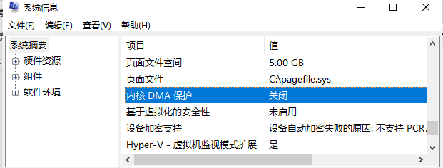 3. 然后查看右侧列表中是否有'内核DMA保护',后面的状态是否为'关闭'。